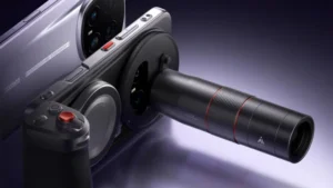 • التصميم: مع العدسة، يأتي الهاتف أيضًا مع مقبض كاميرا للمساعدة في تثبيت الجهاز وتحقيق صور واضحة وثابتة.